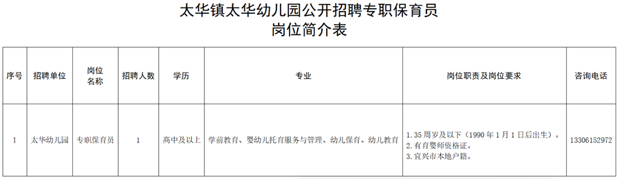 附件:1、太华镇太华幼儿园公开招聘专职保育员岗位简介表